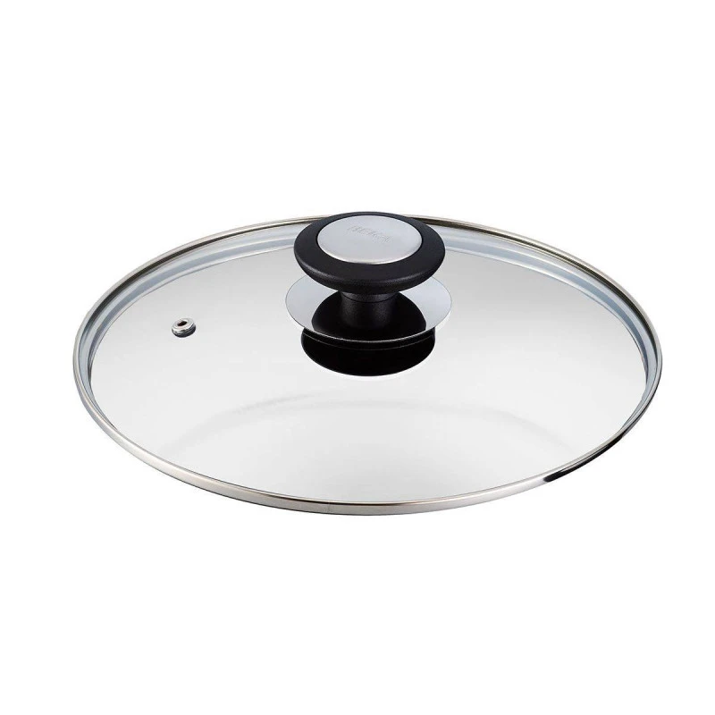 Le couvercle en verre, cerclé inox, dispose d’un trou vapeur.