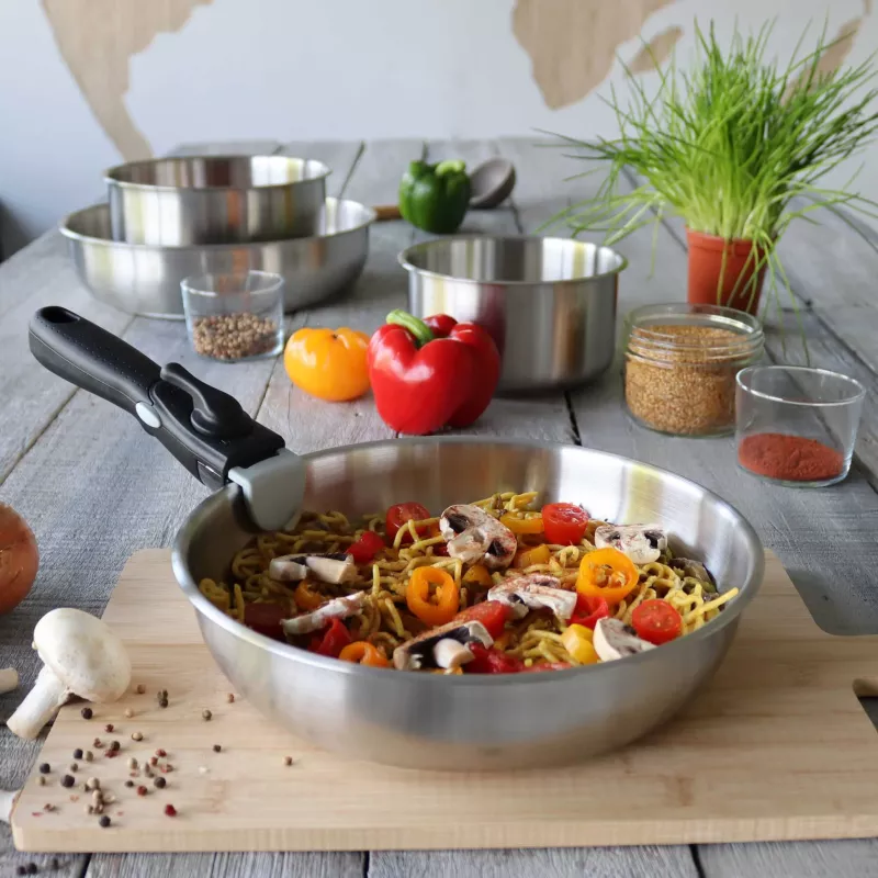 Avec un diamètre de 24 cm, cette poêle est idéale pour une utilisation quotidienne, que ce soit pour saisir, faire sauter ou mijoter vos plats préférés. Son revêtement intérieur en inox garantit une cuisson saine, sans transfert de goût ni de particules indésirables.
