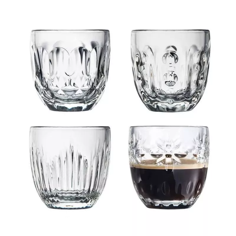 Coffret de 4 tasses en verre pressé avec 4 décors différents reprenant les motifs de taille de La Rochère :